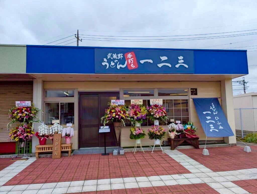 武蔵野うどん一二三は、越谷市場内に新しくオープンした武蔵野うどん専門店です。青い看板とのれんが目印の、すっきりした外観。オープン直後ということもあって、店先にはお祝いのお花が並び、新店らしい華やかさがありました。