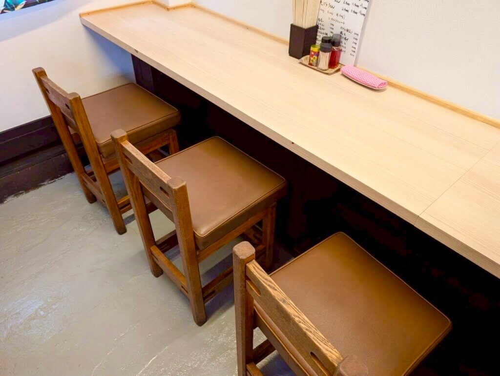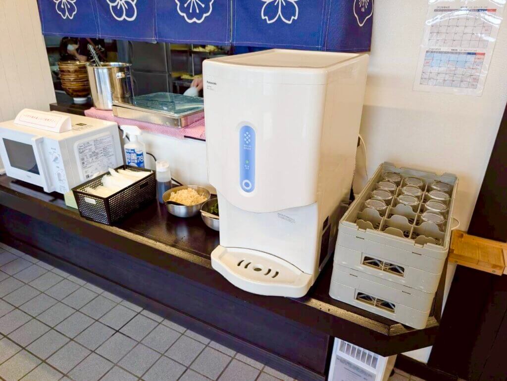 お冷はセルフです。使い勝手のよさを感じました。さらに、天かすやわかめなどが置かれていて、好みに合わせて加えられるのもうれしいです。
