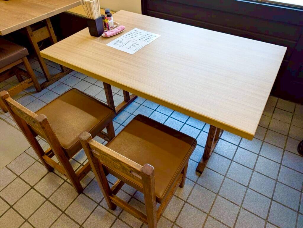 店内はテーブル席とカウンター席があり、ひとりでも複数人でも入りやすそうなつくりでした。木目調のテーブルと落ち着いた色味の椅子で、気取らず食事ができる空気感。市場の食堂らしい気軽さを感じます。