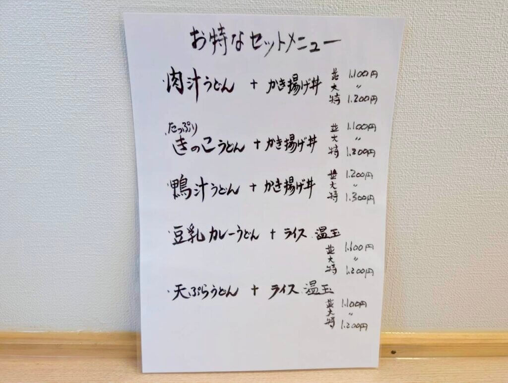 手書きのメニュー表が、どこか親しみやすさを感じます。肉汁うどんや鴨汁うどんのような定番系に加えて、たっぷりきのこうどん、豆乳カレーうどんなど、気になるメニューも。さらにセットメニューではかき揚げ丼やライスと温玉の組み合わせなどがあり、しっかり食べたい人にも満足感のある内容です。