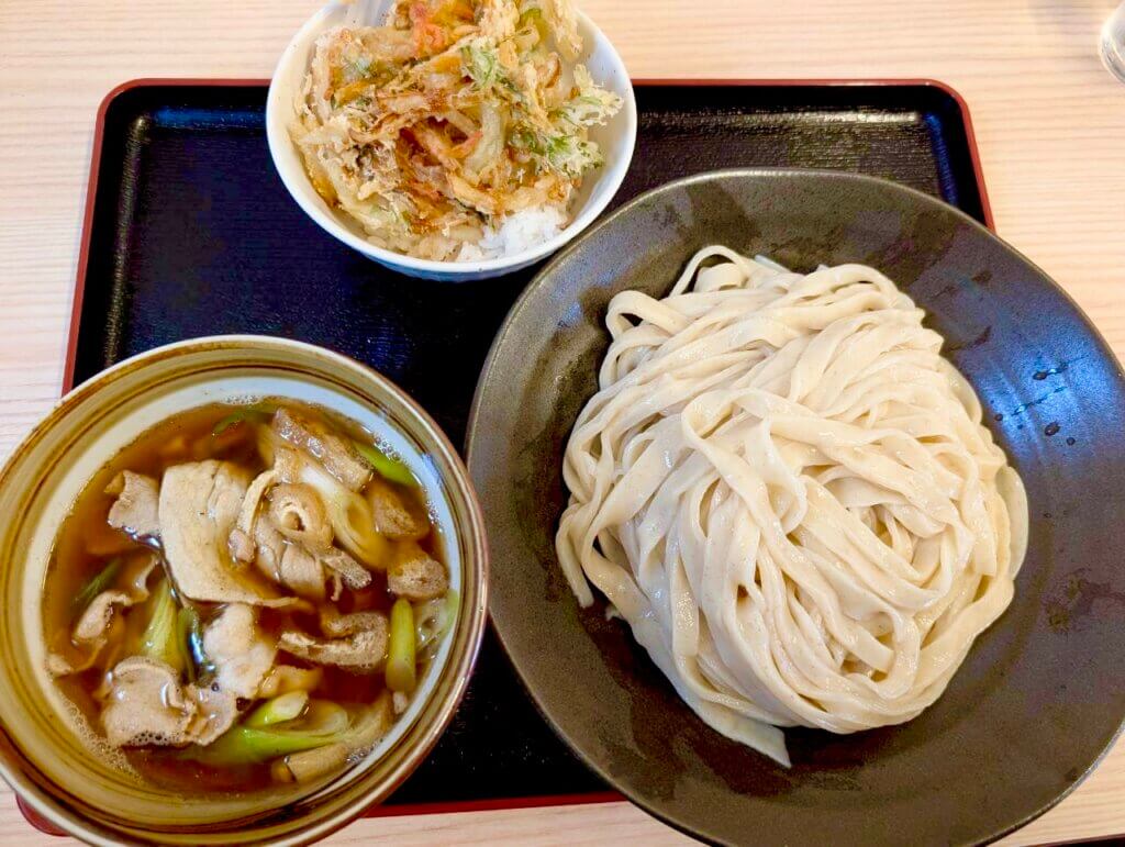 こちらが、武蔵野うどん一二三さんの肉汁うどん+かき揚げ丼セットです。ボリューム満点な武蔵野うどんに具がたっぷり入ったつけ汁。大きな野菜のかき揚げがのったどんぶり。着丼の時点で、大満足確定のお得なセットメニューとなっています。