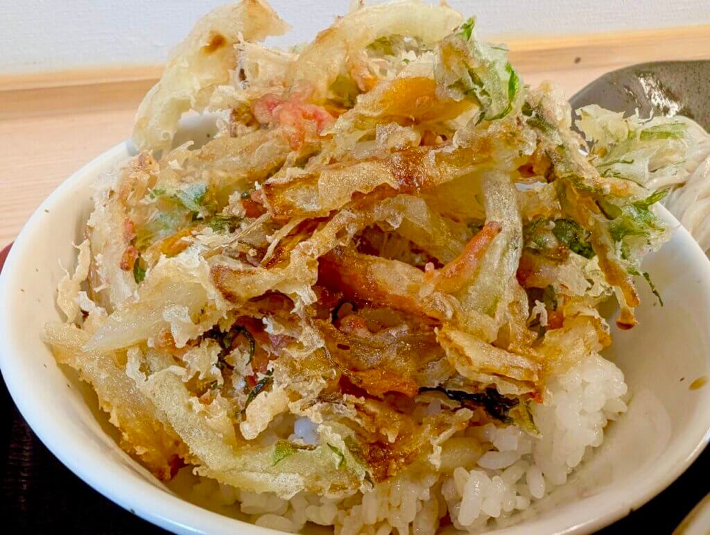 野菜のかき揚げ丼はサクサクシャキシャキ。意外とサッパリ食べられる印象でした。多くの人に喜ばれる、素敵などんぶりです。