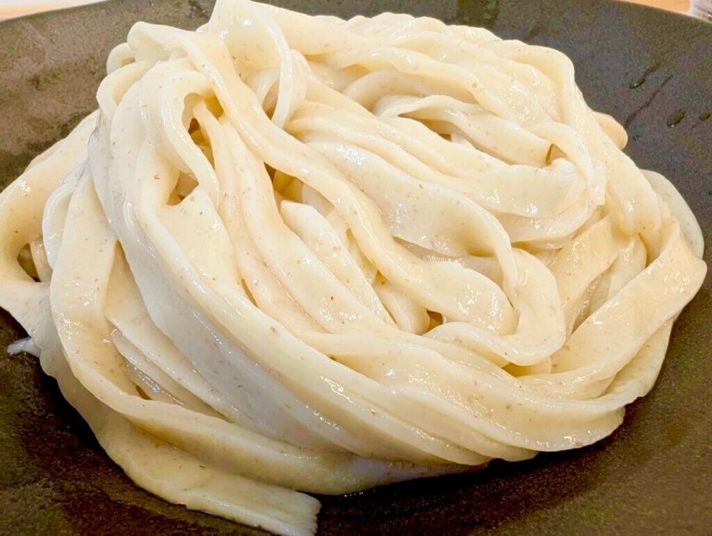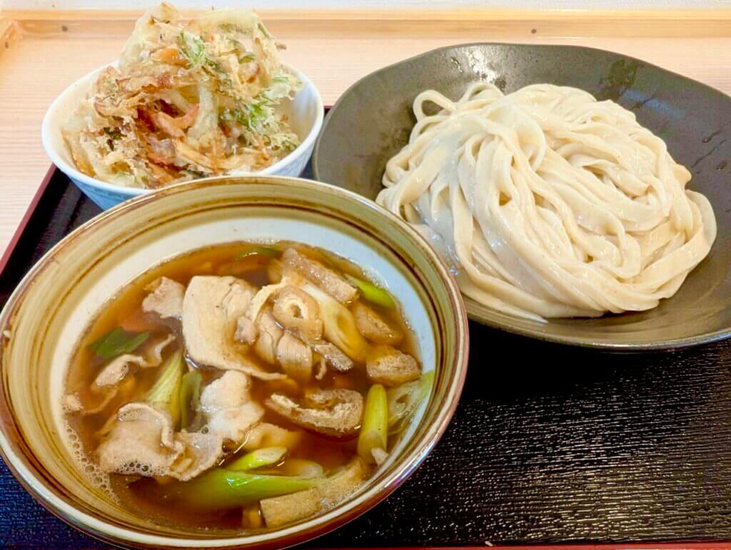 一二三さんの武蔵野うどんは「モチモチ食感」です。噛めば噛むほど、うどん本来の旨味を堪能することが出来ます。出汁の効いたつけ汁は、豚肉の旨味と相まって濃厚な味わいに。補完性の高い一杯に仕上がっています。