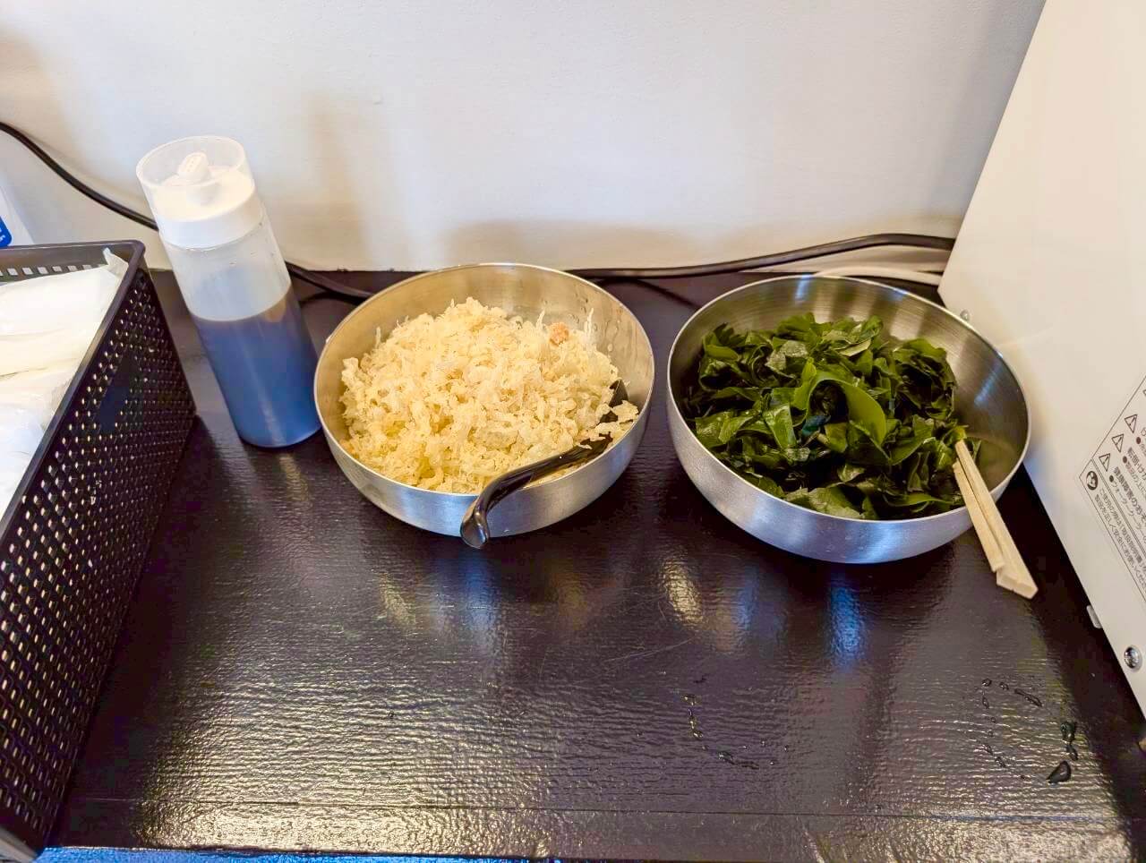 お冷はセルフです。使い勝手のよさを感じました。さらに、天かすやわかめなどが置かれていて、好みに合わせて加えられるのもうれしいです。