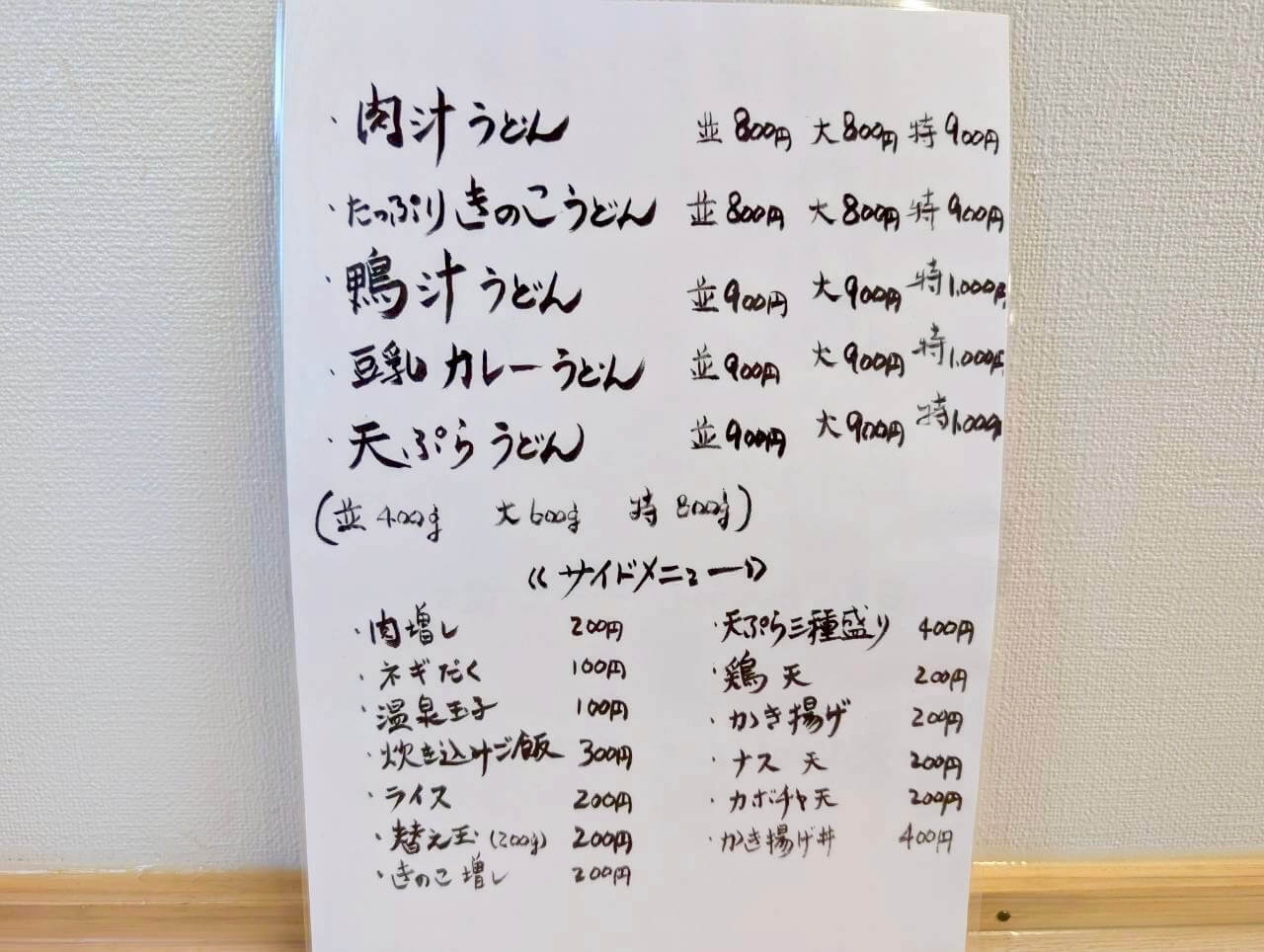 手書きのメニュー表が、どこか親しみやすさを感じます。肉汁うどんや鴨汁うどんのような定番系に加えて、たっぷりきのこうどん、豆乳カレーうどんなど、気になるメニューも。さらにセットメニューではかき揚げ丼やライスと温玉の組み合わせなどがあり、しっかり食べたい人にも満足感のある内容です。