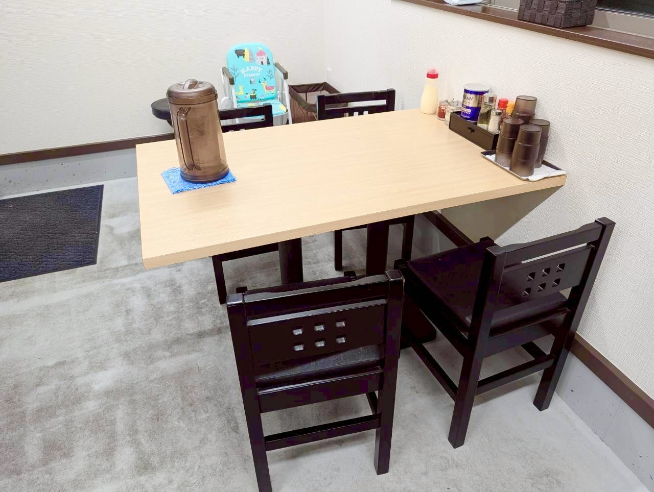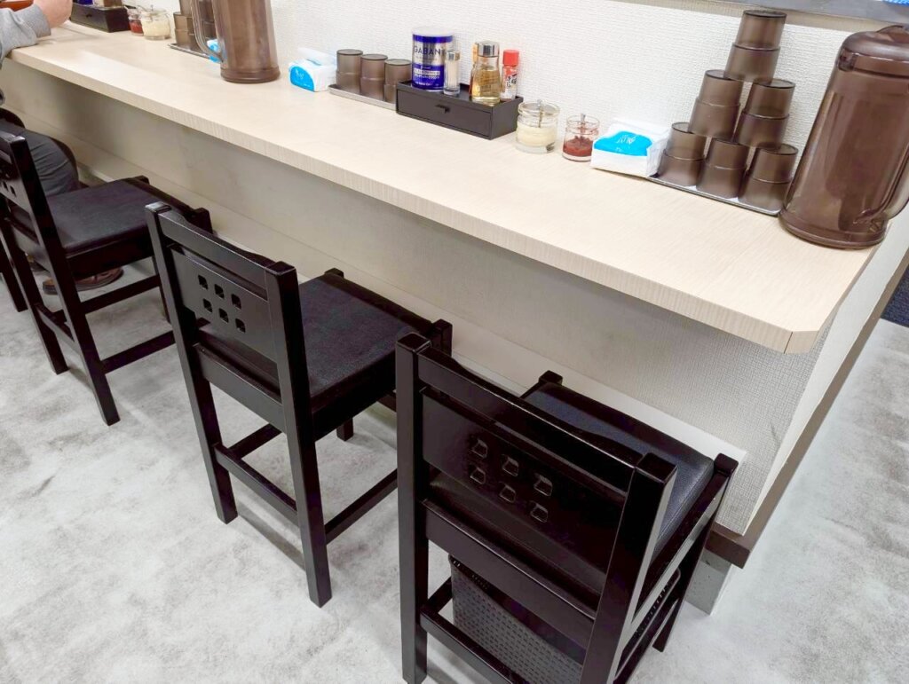 店内はカウンター席とテーブル席があり、全体的にすっきりとした印象。白を基調にした明るい内装で、ラーメン屋らしい気軽さと高級感を併せ持っています。お子さま用の椅子も完備。小さなお子様がいる家族連れでも利用しやすそうです。