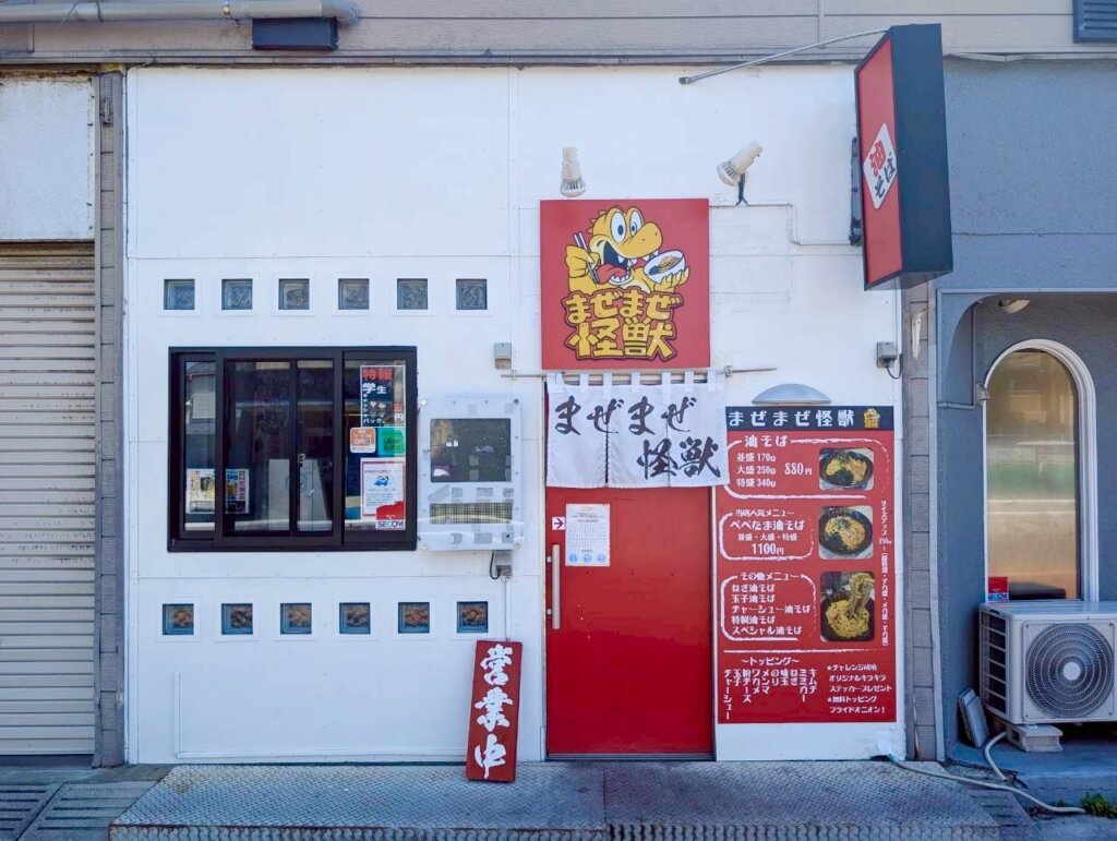 赤山通り沿いの「まぜまぜ怪獣越谷駅前店」は、2025年3月に「笑麺亭越谷店」としてオープンし、同年5月に現在の屋号となった油そば専門店です。目に映る赤色の看板や暖簾、インパクトのある怪獣ロゴがトレードマーク。濃厚だけど食べやすい、そんな油そばを頂くことが出来るお店となっています。