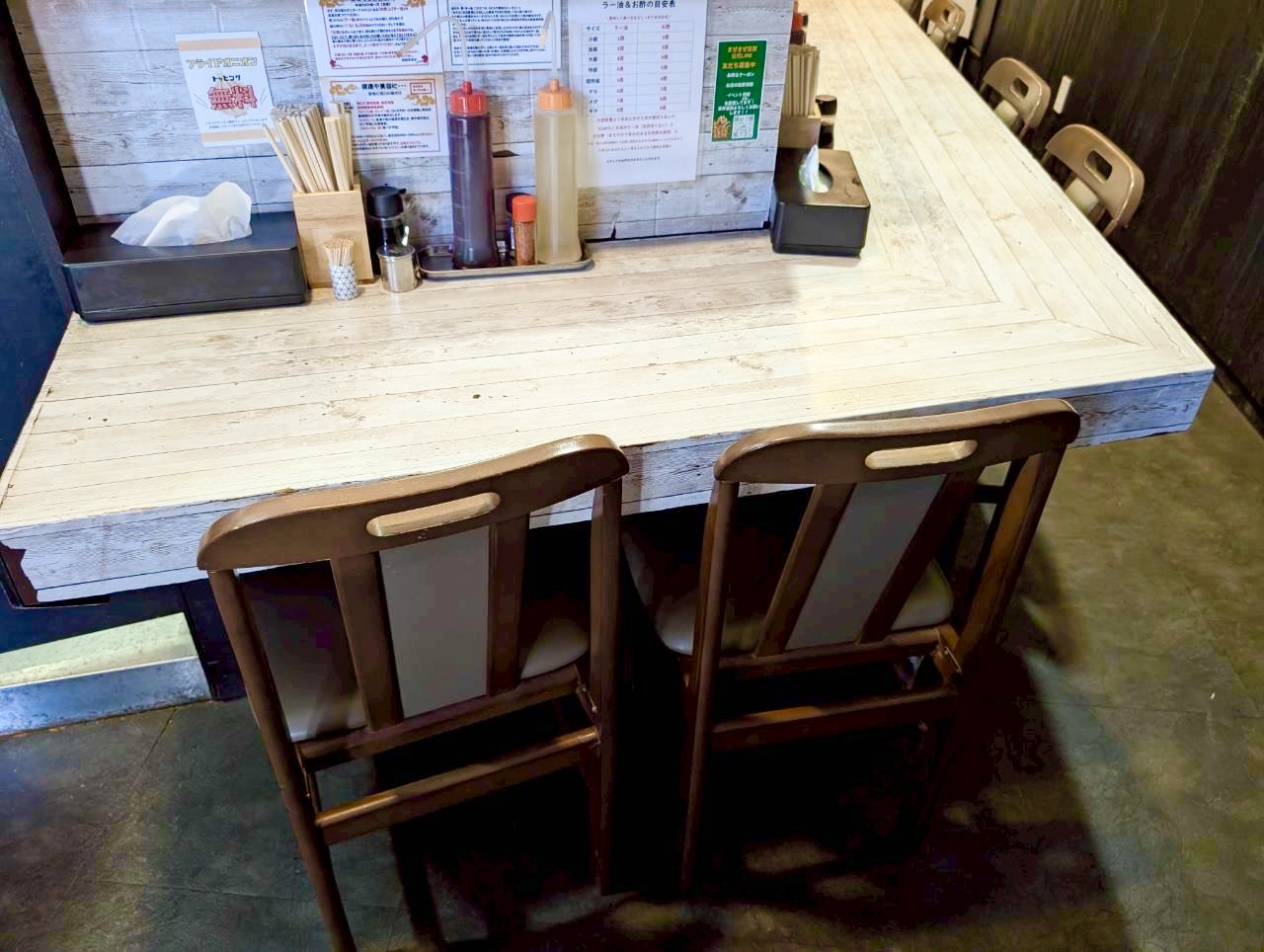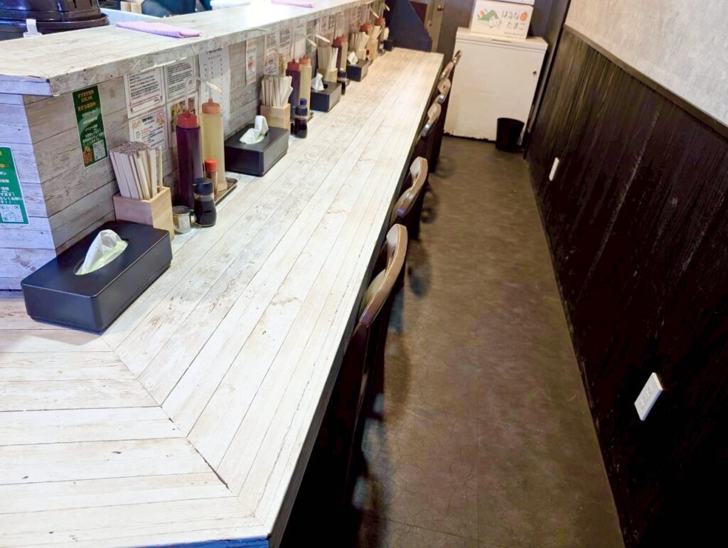 店内はカウンター席が中心のつくりで、ひとりでも入りやすい雰囲気。すっきりとしたカウンターに調味料が並び、油そばを自分好みに仕上げていく楽しさが自然と伝わってきます。