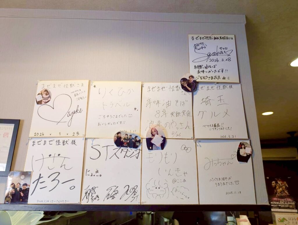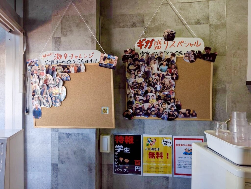 壁にはサイン色紙やチャレンジ達成者の写真が飾られています。常連さんやファンの皆様が、このお店を愛していることが伝わってきました。