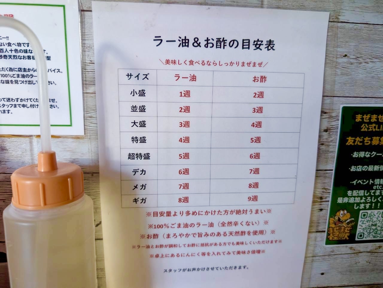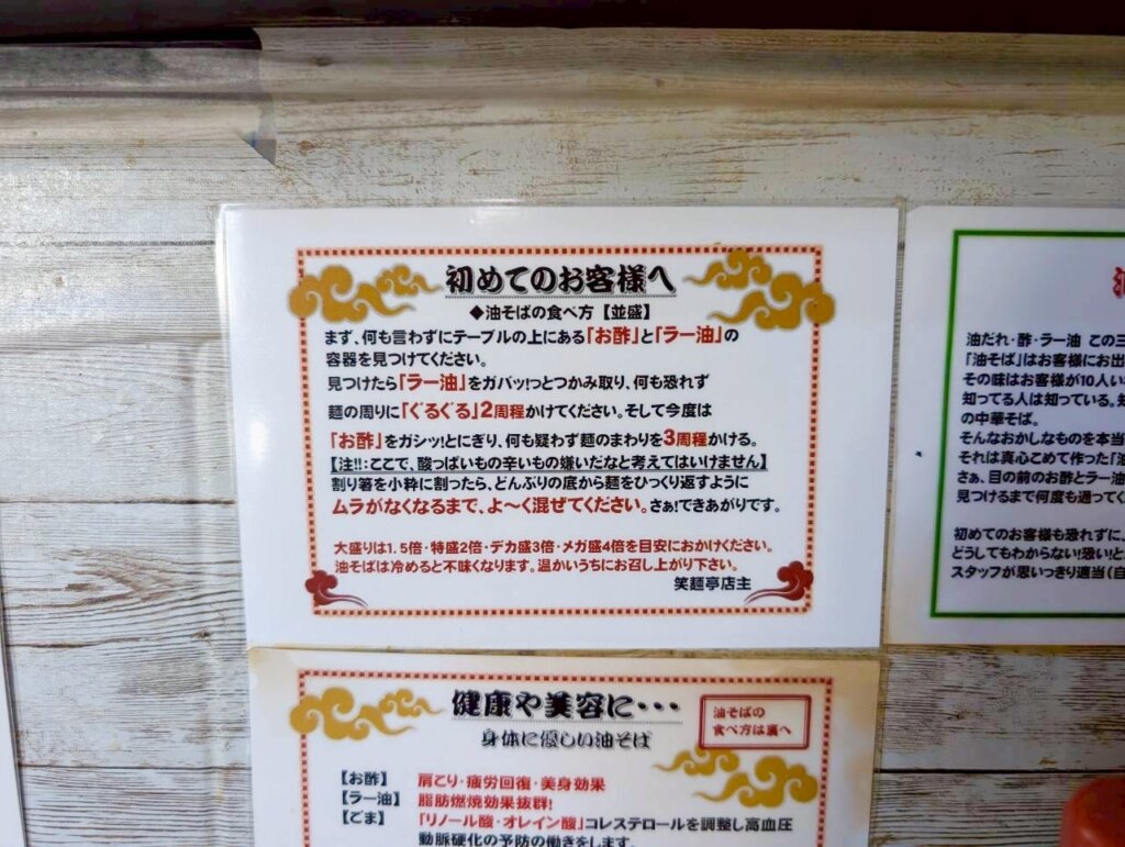 印象的なのは、食べ方の案内がとても丁寧なこと。「初めてのお客様へ」という説明や、ラー油とお酢の目安表まで用意されていて、油そば初心者でも安心して楽しめる工夫がされています。油そばは、提供された時点で完成ではなく、酢やラー油を回しかけてしっかり混ぜて仕上げるスタイルなので、ちょっとした体験型の面白さがあります。