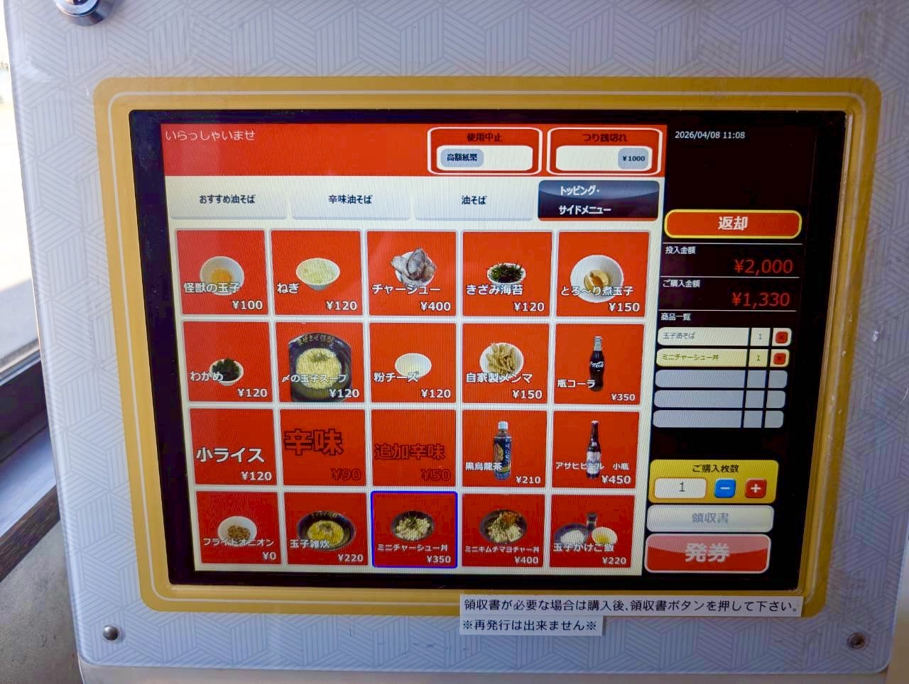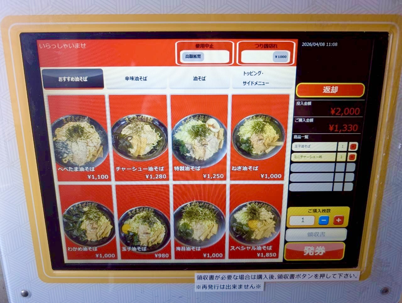 メニューは油そばをベースに、辛味系やチャーシュー系などが並び、トッピングも豊富。追加料金で超特盛、デカ盛、メガ盛、ギガ盛まで選べるのもこの店ならではです。デカ盛ファンの方には魅力的なサイズ展開となっています。