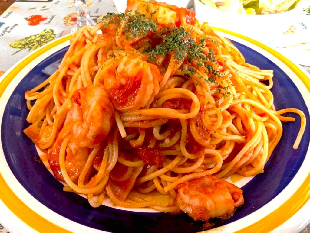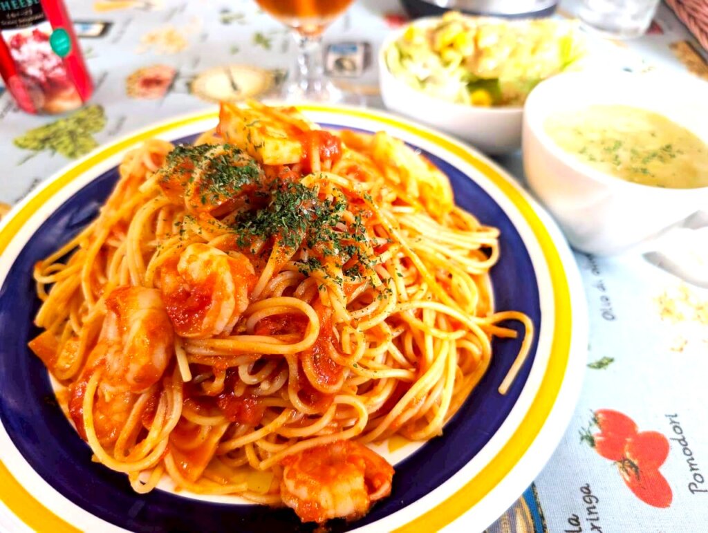 トマトスパゲッティーは、懐かしくて優しい、慣れ親しんだ味わいです。濃厚なトマトソースと、しっとりとしたやわらかいスパゲッティーは相性抜群。酸味と甘みが混ざり合い、食欲をそそります。