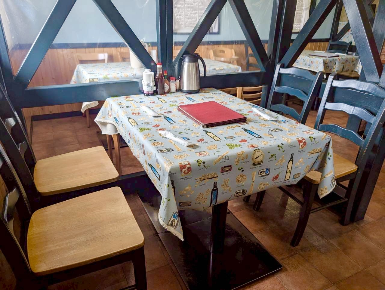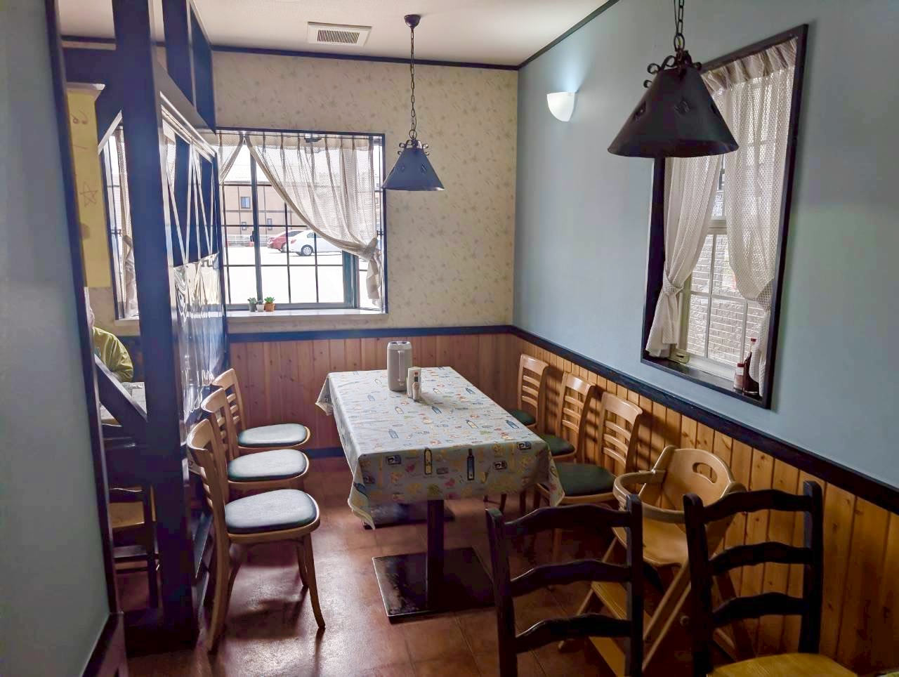 店内はテーブル席がゆったりと配置されていて、のんびりとお食事を楽しめる空間が広がっていました。仕切りのある席もあり、周りを気にしすぎず過ごせるのも魅力です。家族連れでも利用しやすそうな、あたたかみのある店内です。