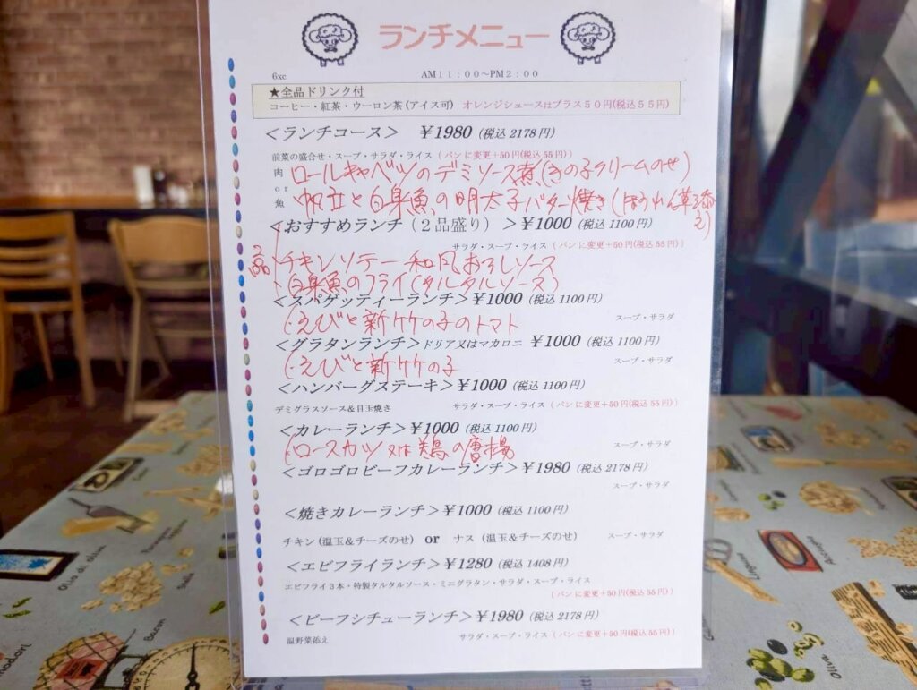 メニューはスパゲッティーやグラタン、ハンバーグ、カレー、ビーフシチューなど、洋食好きにはうれしいラインナップ。ランチメニューは全品ドリンク付きで、食後に一息つけるのもありがたいです。ランチコースもあり、少し贅沢なランチタイムを過ごすこともできます。