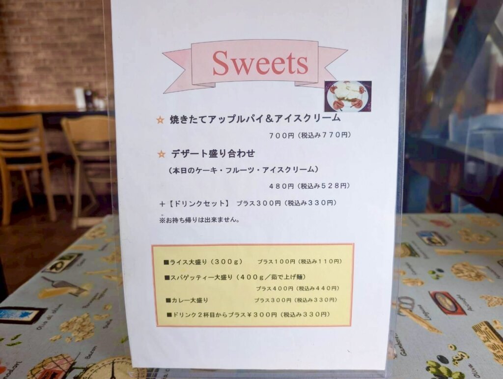 デザートメニューには、焼きたてアップルパイやデザート盛り合わせが。デザート盛り合わせは、ケーキが日によって変わるみたいです。食後までしっかり楽しめるラインナップとなっています。ランチをしっかり食べたい日にも、少しゆっくり過ごしたい日にもぴったりです。