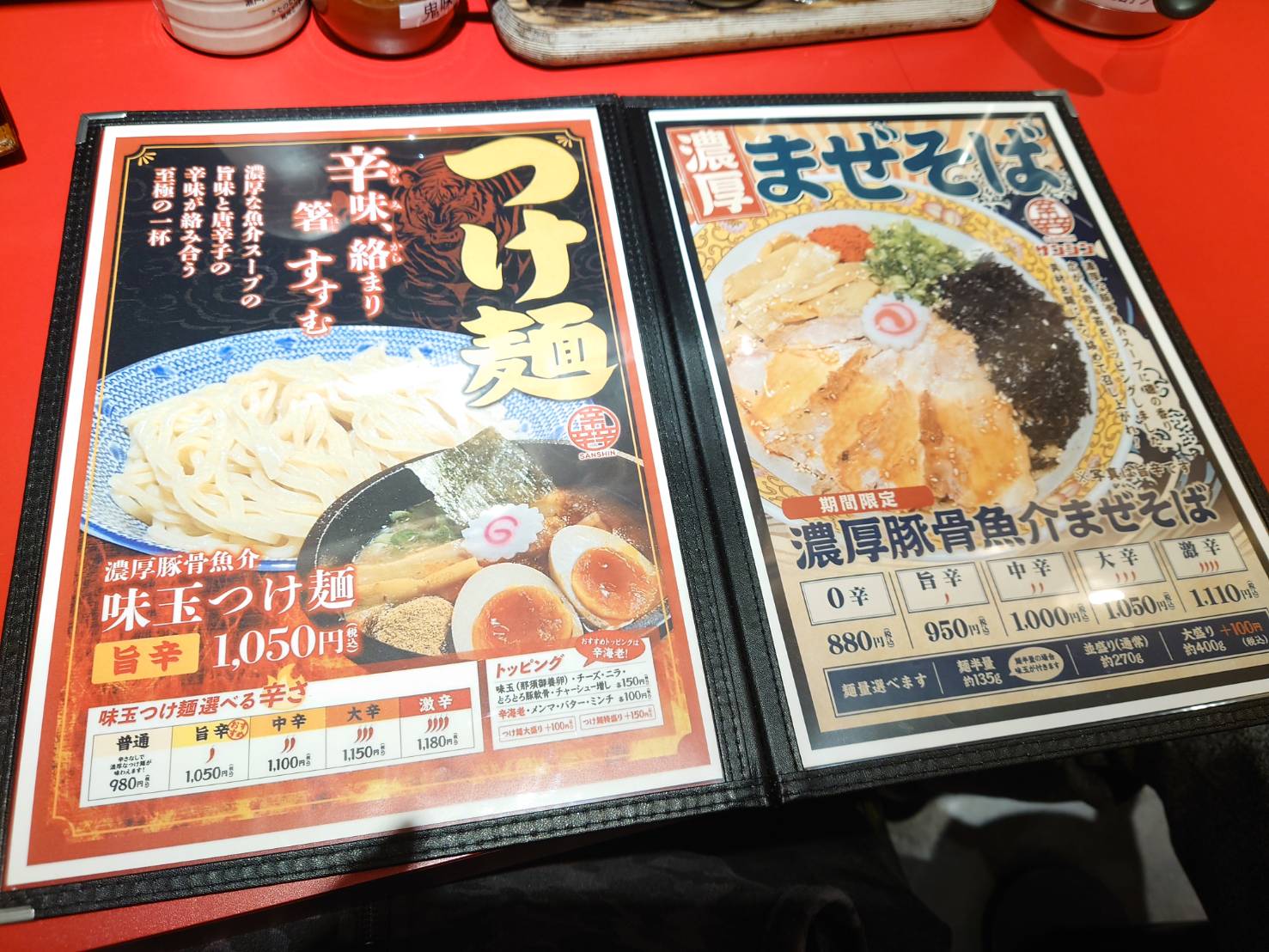 カウンターに座ると、目の前にメニューが置いてありました。店頭にあった辛麺やつけ麺の他に、
