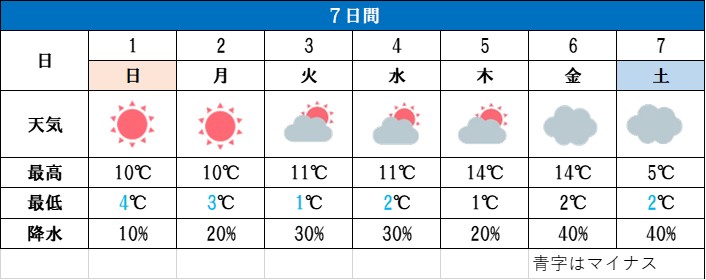 雲が目立つことはあっても、日差しの届く日が多くなります。空気の乾燥に要注意。週中頃は気温が上がっても、次の週末は寒さが戻ります。気温変化にもお気を。
