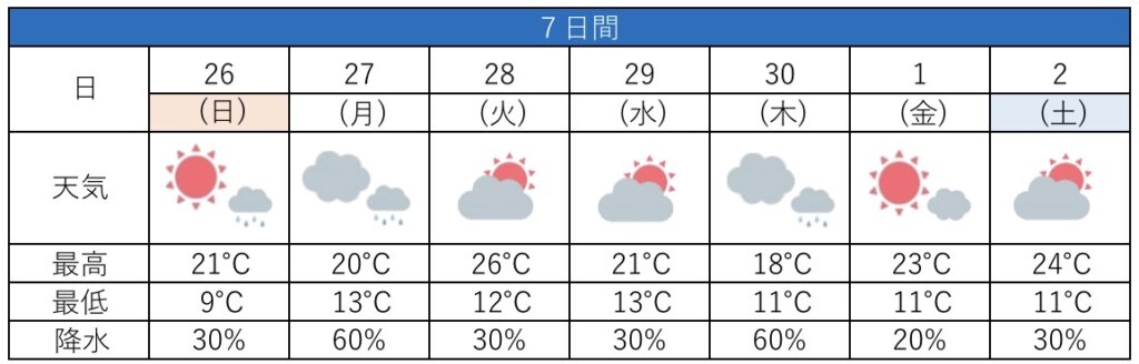 天気は周期的に変わりそうです。晴れ間が出る日は日差しを上手に活用しましょう。気温は平年並みの日が多い一方、雨の日は体感が下がって少しひんやり感じることも。脱ぎ着しやすい服装で調整を。