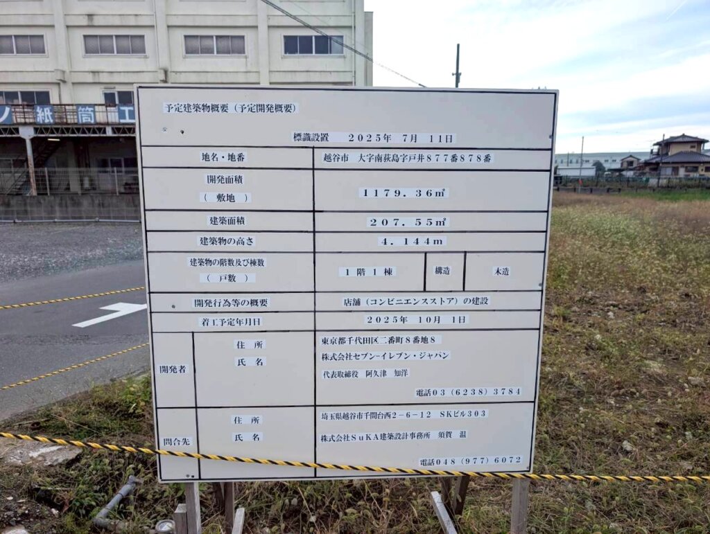 現在詳細はまだ確認できませんが、空き地の看板の概要にコンビニエンスストアの建設と記されていました。開発者の欄にはセブンイレブンジャパンと表記されているのでセブンイレブンがオープンすると予想されます。いつオープンするのか、引き続き情報を追いかけていこうと思います。