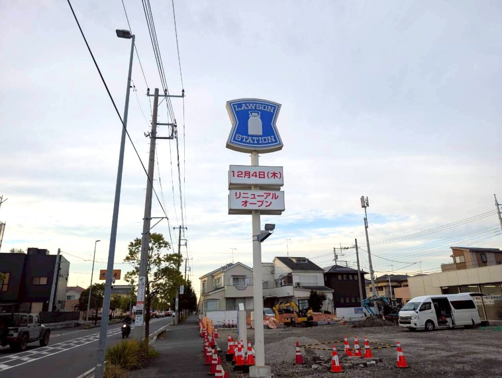 産業道路沿いにあるローソンがリニューアルオープンするそうです。看板の下には12月4日リニューアルオープンと記載されています。現在ある店舗のすぐ隣にリニューアルオープンするとのことで、10月23日から12月3日まで休業しています。新しい店舗と古い店舗が今後どうなるのかも追いかけていこうと思います。