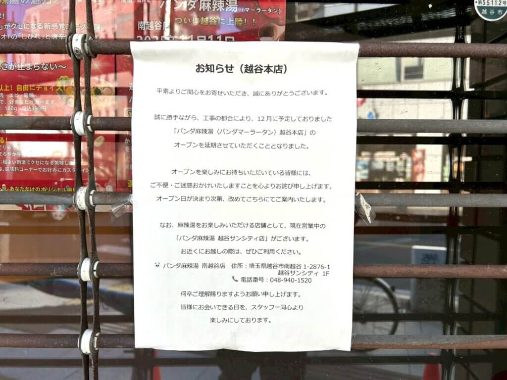 2024年7月に閉店した県民共済紳士服越谷店の跡地にオープン予定のパンダ麻辣湯越谷本店が、2025年12月のオープン予定を延期したようです。現場に行くと、「工事の都合による延期と記された張り紙」が入口に張ってありました。明確なオープン日については、現状は分からないとのことです。オープン日が判明するまで、引き続き情報を追いかけていきます。