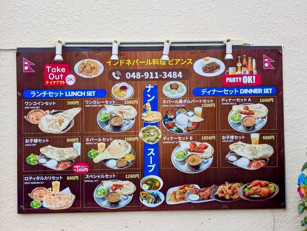 「ビアンスダイニング」は、焼きたてナンとスパイス香るカレー、さらに人気のネパール料理も味わえるお店です。おすすめ料理は、バターチキンカレー、キーマカレー、チーズナン、タンドリーチキン、チキンティッカ、ビリヤニなどなど。店頭のメニュー看板を見ると、ランチセットやディナーセットのほか、お子さまセットやテイクアウト対応などもあり、幅広く利用しやすそうな印象です。本格的なインド・ネパール料理が楽しめるとあって、気になる方も多いのではないでしょうか。