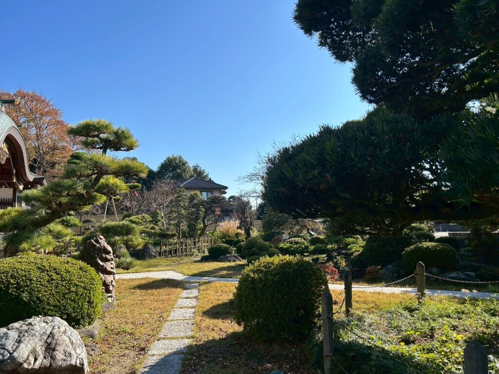 本殿は何度も修理されて現在も綺麗に残っています。大きな本殿で何か神秘的な力を感じることが出来ます。広々とした庭園が見えてきます。芝生も綺麗に整えられています。越谷市内で京都のような空気を味わうことが出来ます。