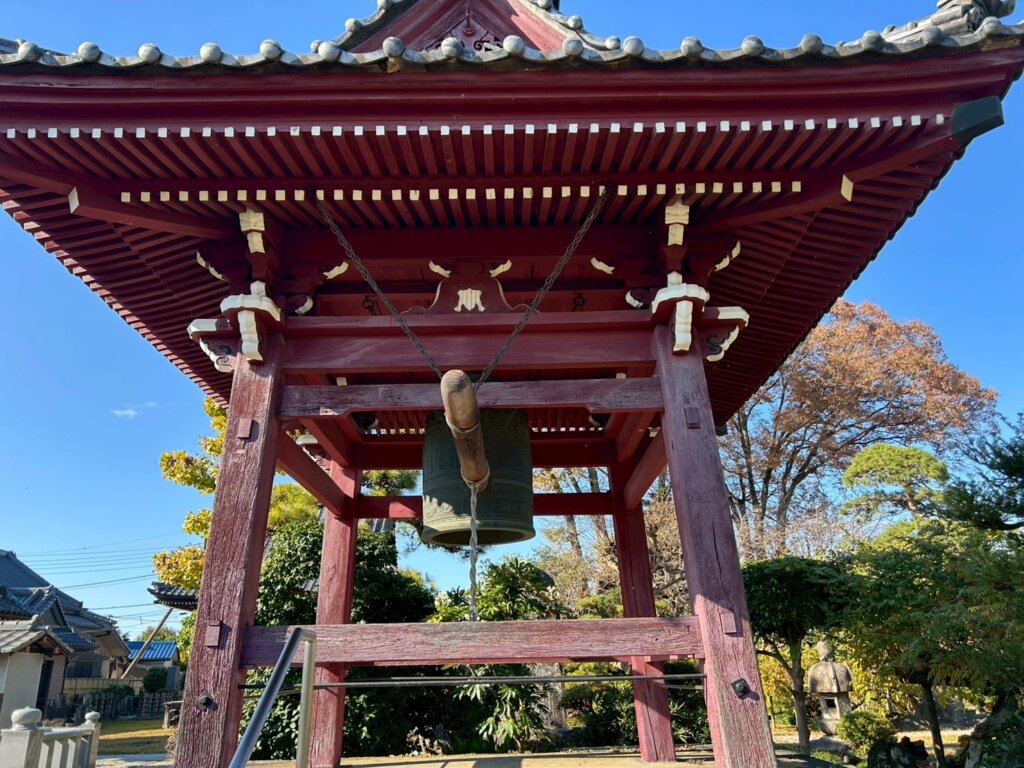 除夜の鐘が置かれています。薄く塗られた赤色が、緑色の庭園と茶色の本殿の中でとても映えています。もうすぐ年末、とても楽しみです。