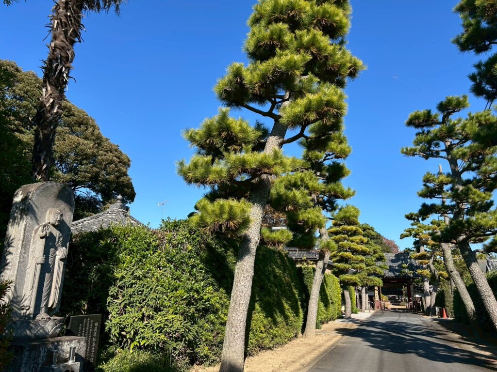 入り口まで等間隔で綺麗に松の木が植えられています。歴史を肌で感じることが出来るスポットになっています。静かな環境の中に美しい景色が隠れています。空が青い日には、松の木の緑色がとても映えます。
