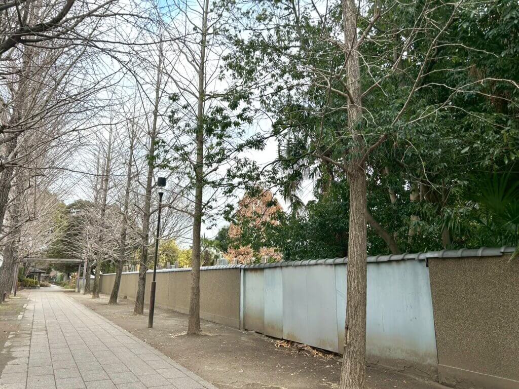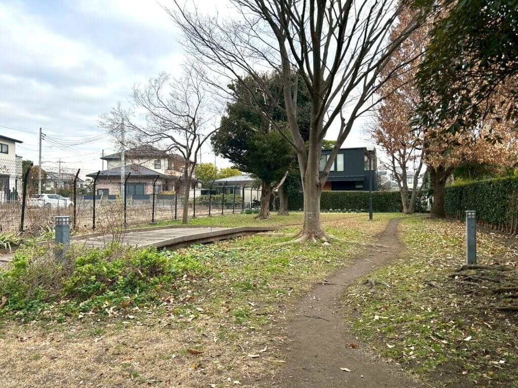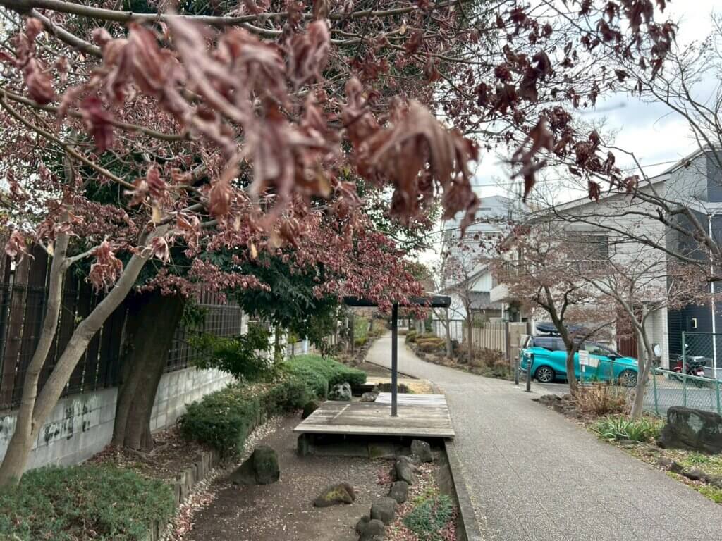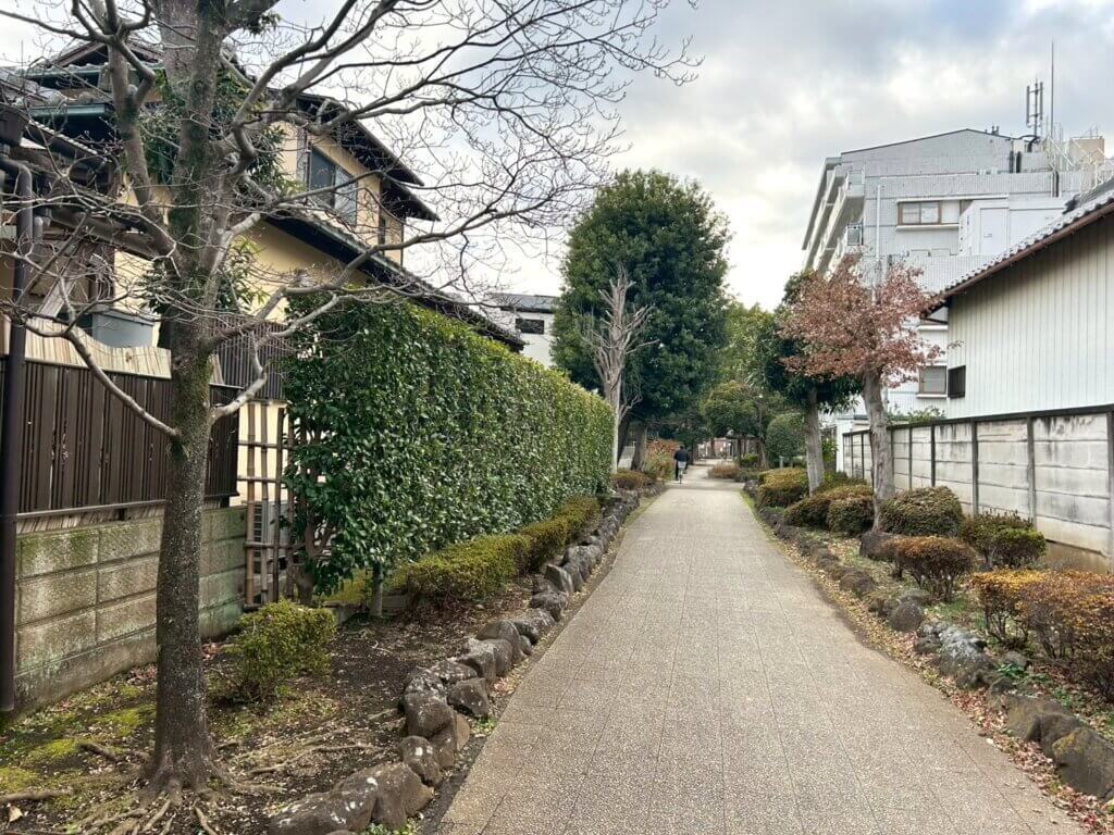 瓦曾根にあるさくら幼稚園の横にはとても素敵な緑道がありました。撮影日は曇っていたのですが、晴れた日にはポカポカとした暖かい小道が続いています。道路がアスファルトで塗り固められたわけではなく、タイルがしかれているので意図的に作られた素敵な場所になっています。立派な木は石で囲われているので雰囲気もあります。