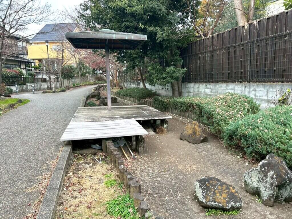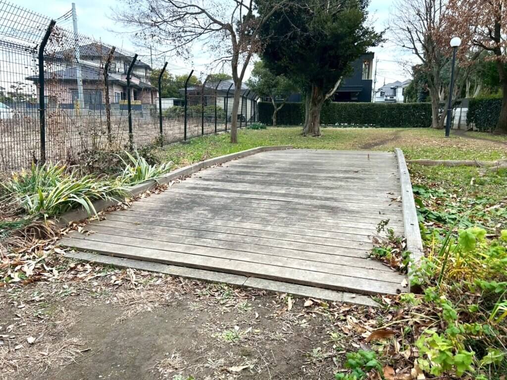 緑道の真ん中には広場がありました。用途はわからない謎の板で作られ橋があり、その横の看板には団体名「どんじゃら・ほい」という怪文書が。管理してくれている団体の名前だと思うのですが、この広場の用途が謎に包まれています。なだらかな橋になっているので子供の散歩道としても安全を考慮されていました。