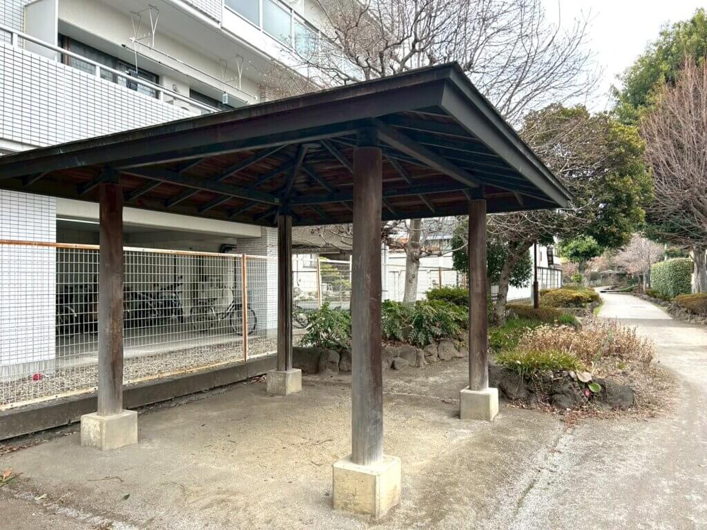 用水路の方面まで続いていました。夏頃には水が流れてくるのでしょうか。入り口はいちょうですが、こちら側には紅葉が見られました。小さな川には秋になると紅葉が落ちて、赤い川を生み出すことでしょう。屋根がある休憩所でお茶をしながら紅葉を眺める午後を過ごすことができますね。
