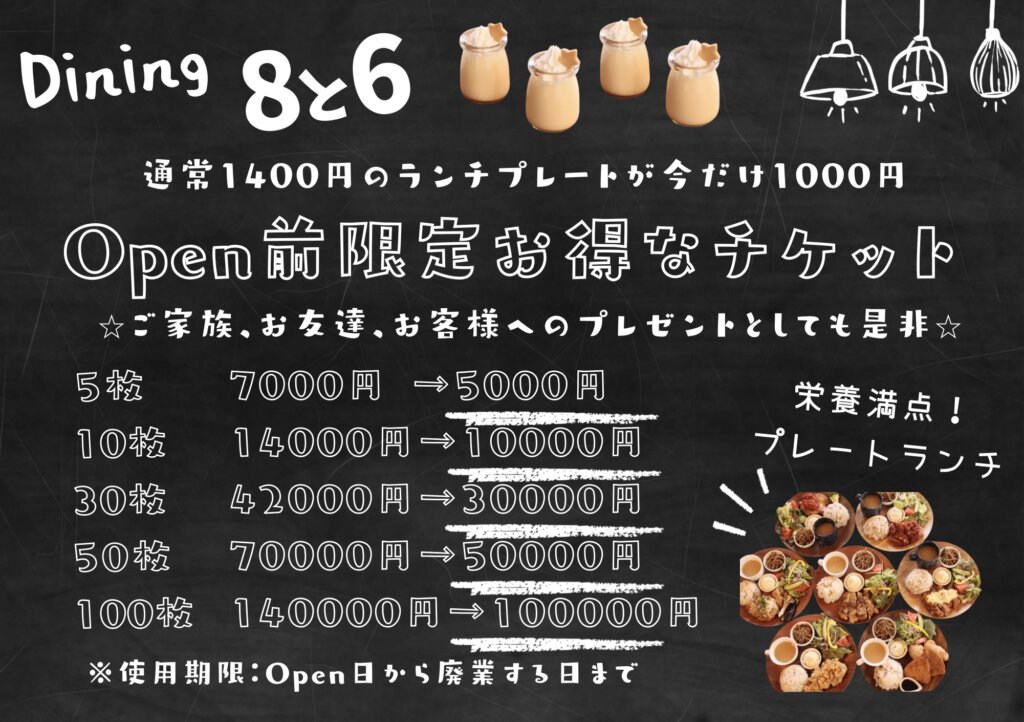 Openしたら沢山の方達に来てほしい!という願いを込めたOpen前のお得過ぎるお食事チケット販売をしています。