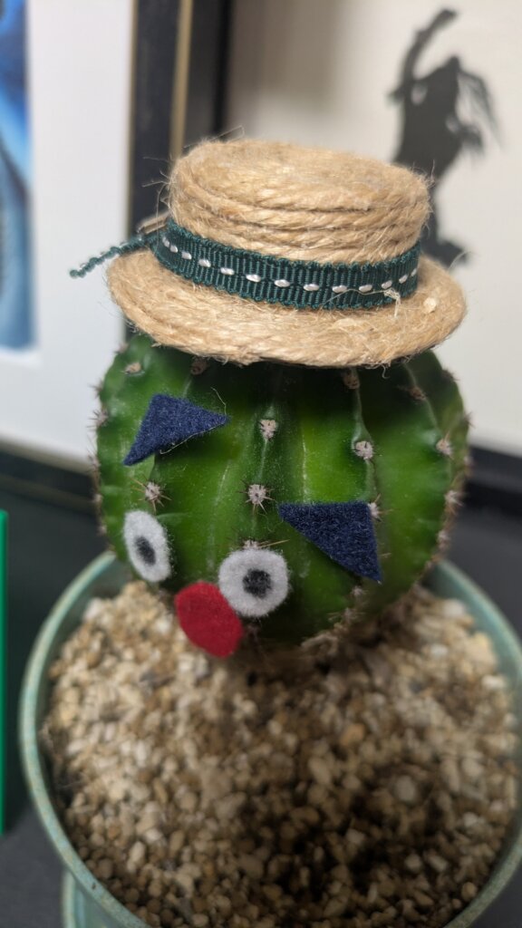“Aさんからいただいた、私の相方のデコレートがされたサボテンちゃん。忙しくてだいぶ水やりを放置してしまっていたのに、ちゃんと生き延びてる〜!ちょっと構ってやらないとふてくされる葱ハウス主とは大違いだ。”