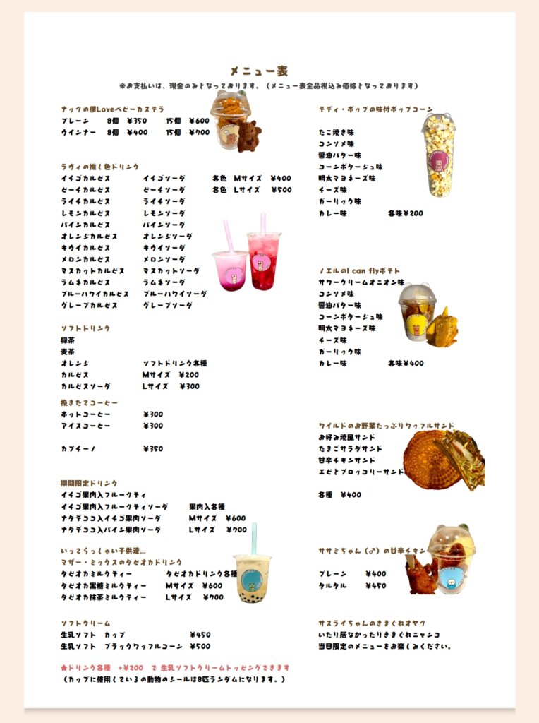 越谷市大里のベビーカステラのお店cafe∞(eight)ではリスの形をしたベビーカステラの他に8匹の動物達をイメージしたメニューが勢揃いです。ふわふわもちもちのベビーカステラや8種のフレーバーポップコーンやポテトもこだわりの仕上がりとなっております。