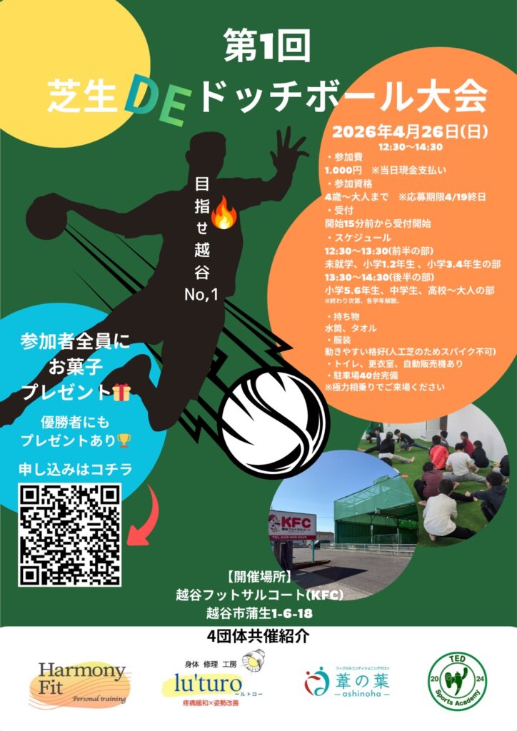 4/26(日)12時半〜14時半 越谷フットサルコート(越谷市蒲生)にて、【第一回芝生DEドッチボール大会】を開催いたします! 越谷市内の事業所4店舗共催で、今後定期開催したいと思っております。 当日は、未就学の部〜大人の部まで部門ごとに分かれての試合となります。誰もが1度はやったことのある”ドッチボール”を通じて、運動機会や地域の交流の機会を増やしてほしいと思っております。ぜひたくさんのご応募お待ちしてます。