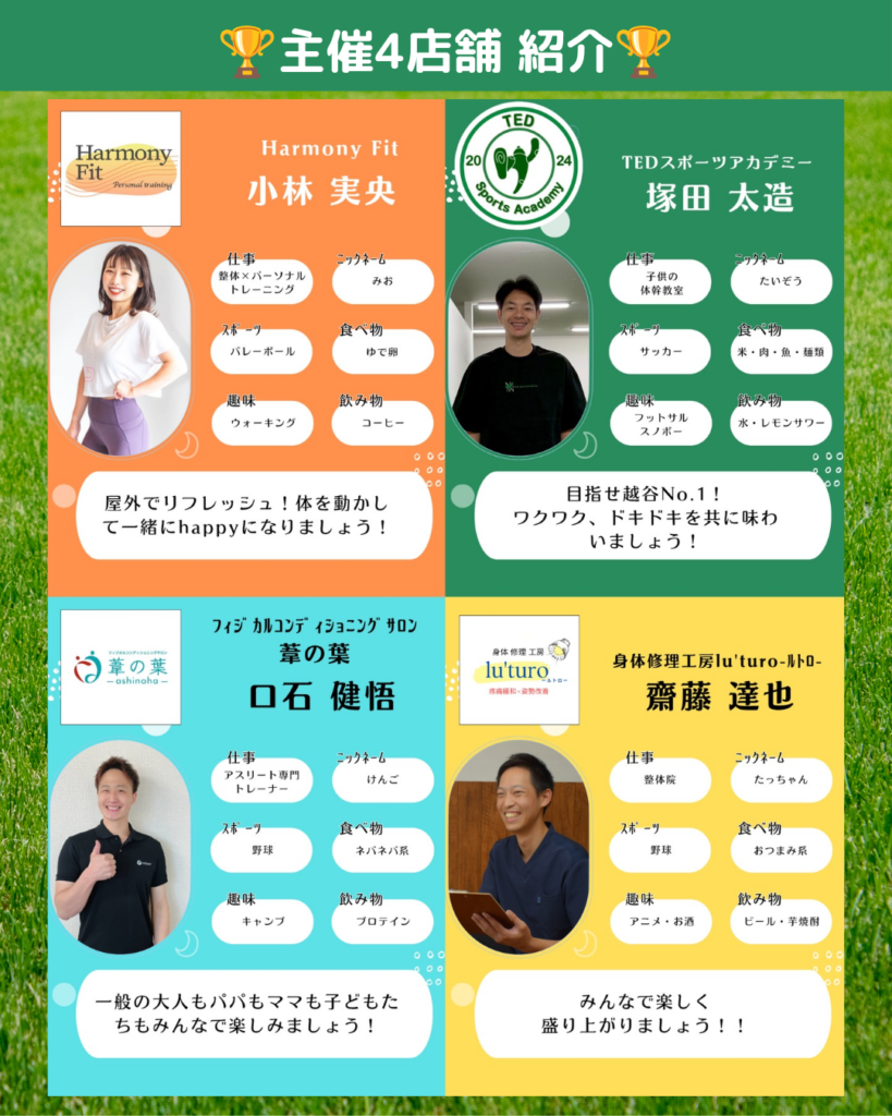 身体修理工房lu’turo-ルトロ-の齋藤達也さんからのコメント:「赤山町で整体院を営んでおります。この度越谷の4事業所子共催でドッチボール大会を開催する運びとなり、発信したいと思っております」